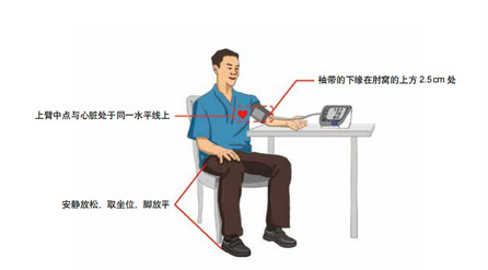 测量前应坐于有靠背的座椅上,双脚自然平放,裸露上臂,上臂及血压计与心脏处同一水平,老年人、糖尿病患者及出现体位性低血压的情况,应加测站立位血压。