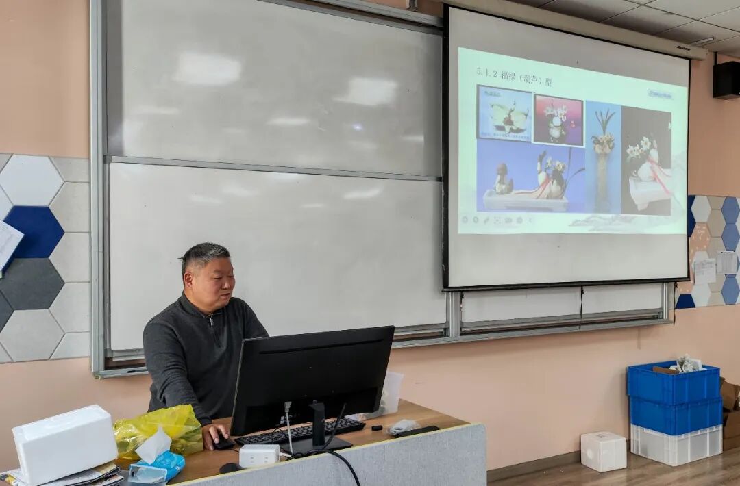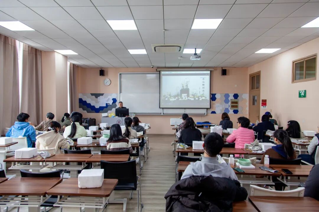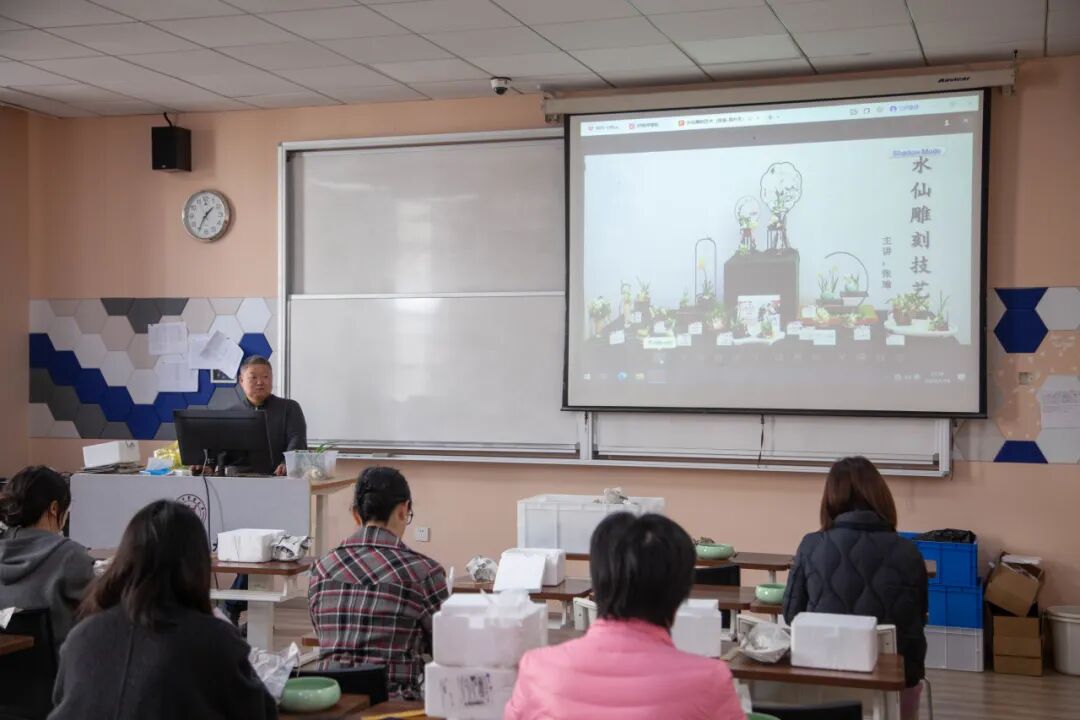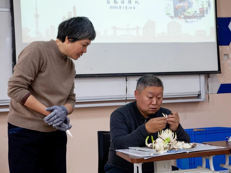 作为沪上知名的“禅意派”水仙雕刻大师,张瑜老师擅长以独特的雕刻手法融合自然与人文,其作品兼具艺术观赏性与思想深度。活动伊始,张老师以生动的语言为师生们科普了水仙的生长习性和文化内涵。作为传统观赏花卉,水仙在中国的栽培历史长达千年,承载着深厚的文化底蕴,“崇明水仙传统栽培技艺”更被列入上海市非物质文化遗产名录。随后,张老师结合实物演示,详细拆解了水仙花雕刻的关键步骤:从净化鳞茎、开盖疏隙,到剥苞削叶、刮梗修整,每一个环节的力度把控、角度选择都讲解得细致入微,让原本对雕刻技艺感到陌生的师生们豁然开朗。