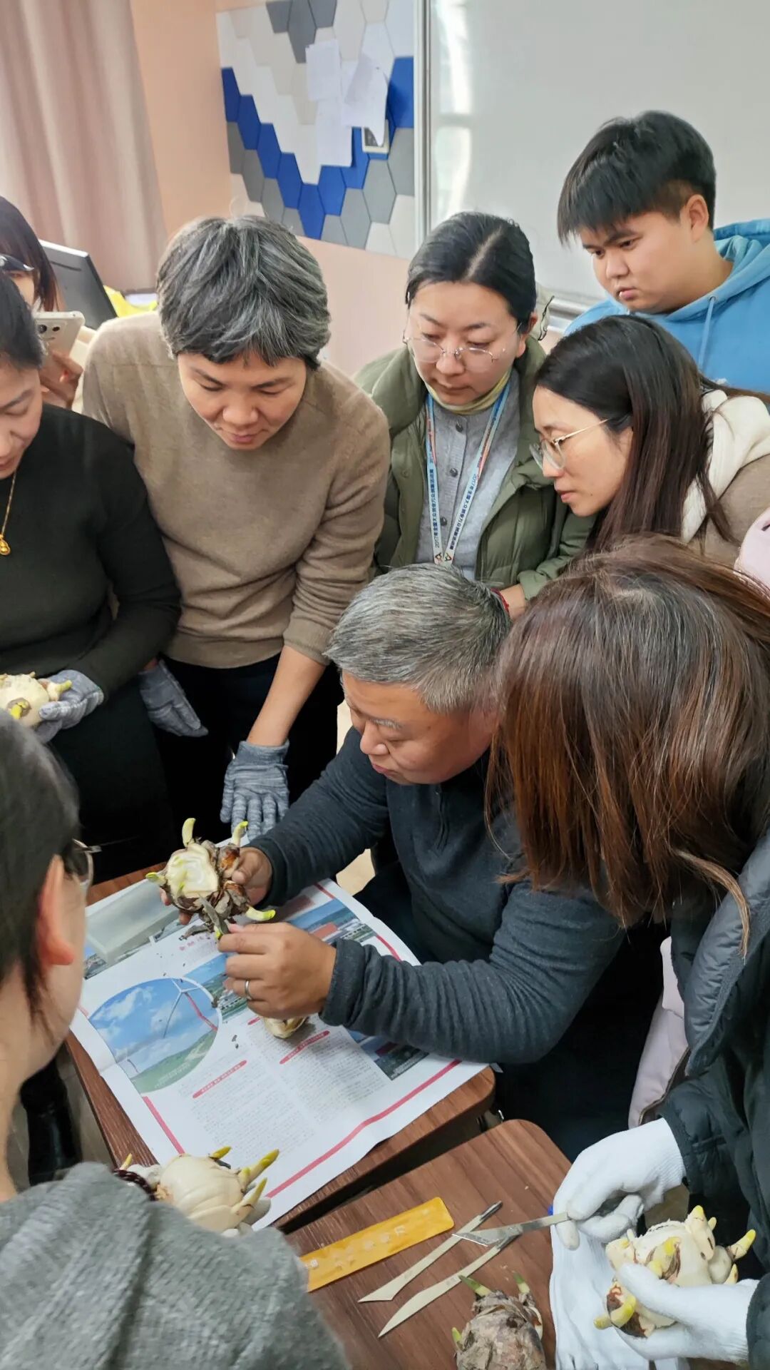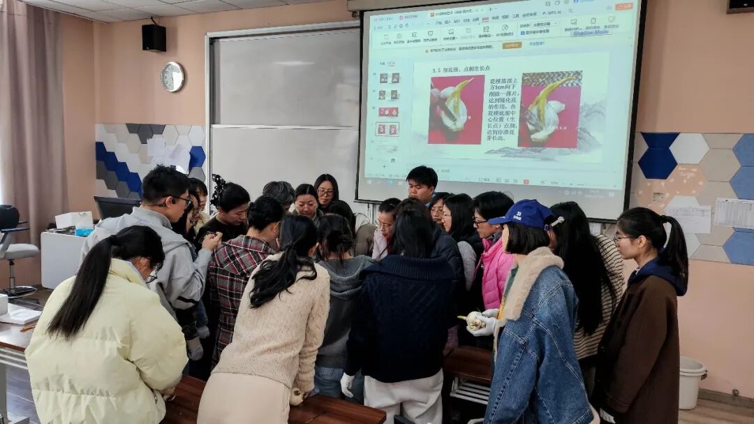 实操环节中,师生们化身“匠心花匠”,小心翼翼地拿起刻刀,根据老师的指导开始雕琢手中的水仙球茎。看似简单的操作,实则极具挑战:既要剥离外层鳞片以露出芽体,又要精准把控下刀力度,避免损伤娇嫩的花芽。遇到困惑时,张老师便俯身手把手指导,耐心纠正大家的手法;师生之间也相互交流心得,分享操作技巧,现场氛围温馨而热烈。