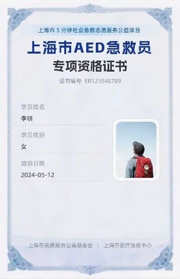 培训相关事宜: 急救培训为理论和实际操作相结合教学,学员穿行动便利服装为宜。培训结束后可获得上海市AED急救员专项资格证书,样式如下: