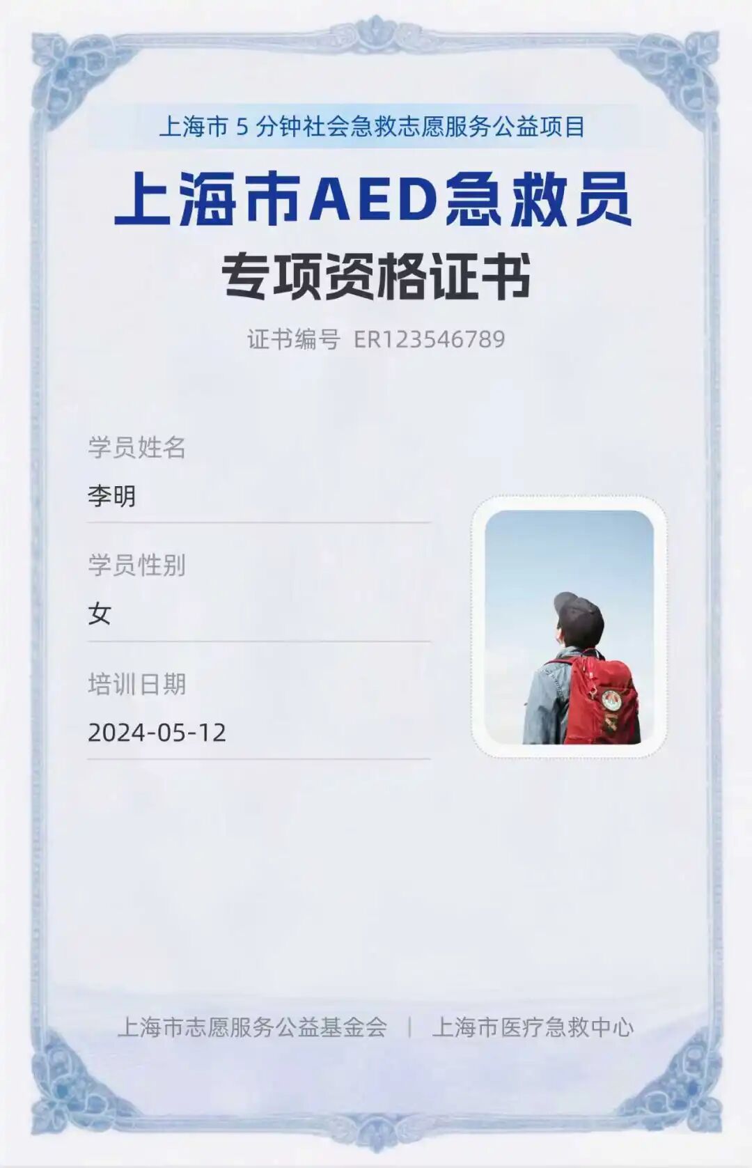 培训要求:请穿着行动便利的服装,培训结束后可获得上海市AED急救员专项资格证书。